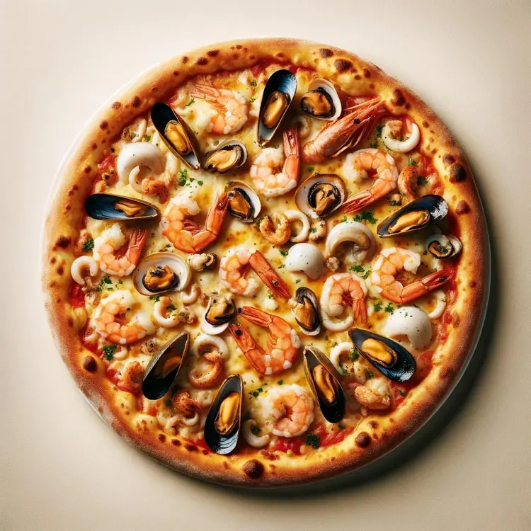 Con pomodoro, mozzarella e una selezione di frutti di mare come gamberetti, calamari e cozze